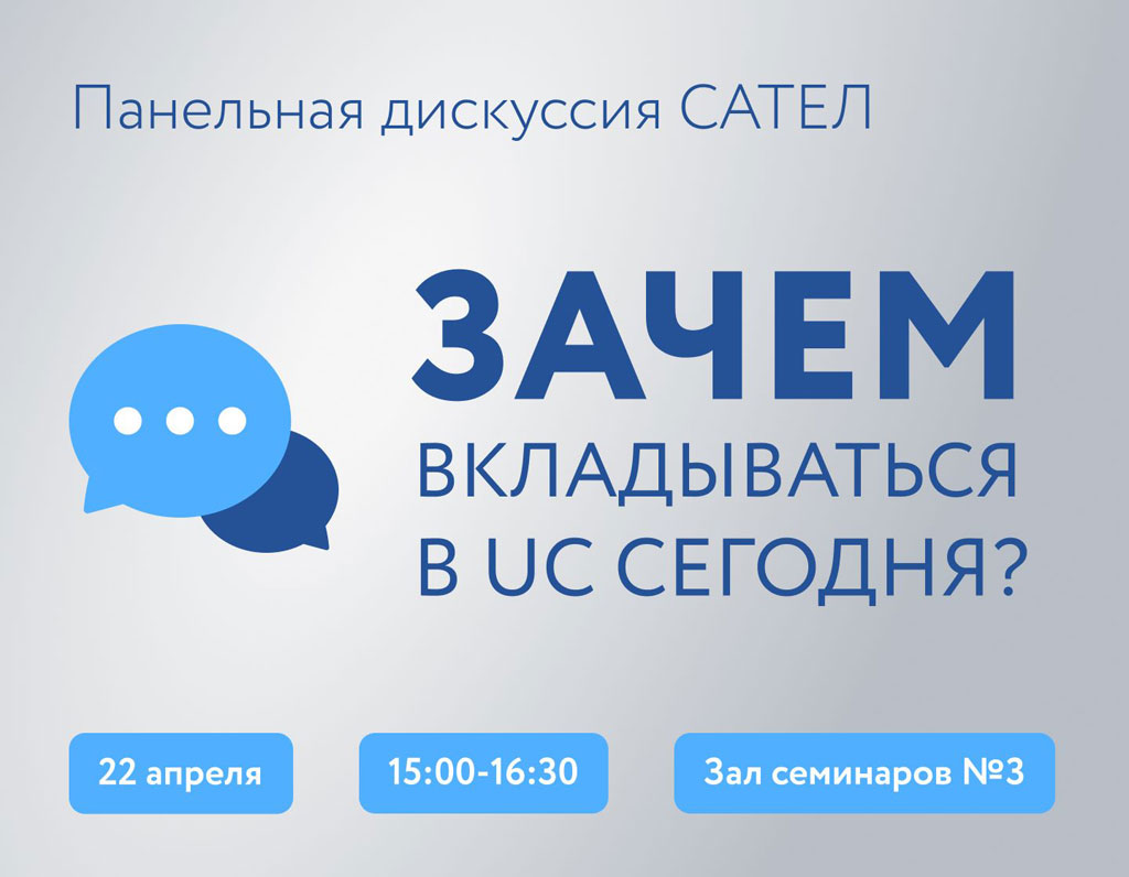 Компания «САТЕЛ» приглашает всех желающих послушать панельную дискуссию «Зачем вкладываться в UC сегодня?», которая состоится 22 апреля в 15.00 в павильоне №2, в зале семинаров №3.